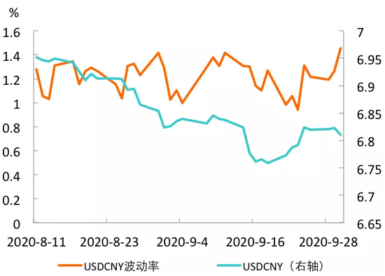 8月初USDCNY随着美元指数走弱而稳步下行,期间波动率指数平稳震荡,表明汇率走势平稳,未超出市场预期。随后USDCNY在9月中旬小幅反弹后在6.80上方窄幅震荡,走势平稳。然而波动率指数却在9月底迅速升高,表明市场对USDCNY国庆后大幅波动的情绪升温。