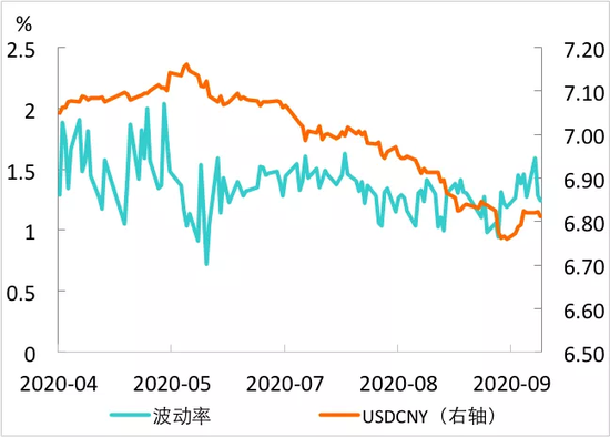 由于今年USDCNY从4月至9月波动较大,笔者选取该时间段的数据进行回测。为提高波动率指数反应速度,使用一周的波动率进行计算。USDCNY波动率指数和汇率走势见图2。