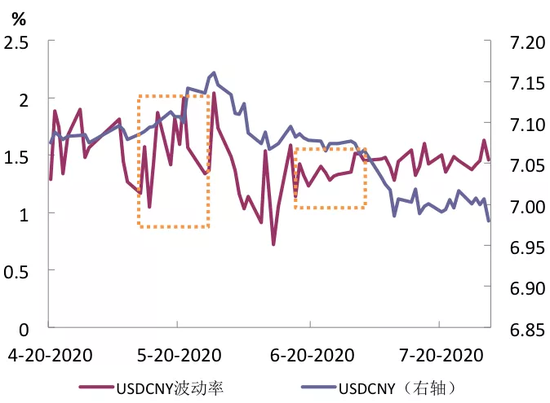 图3 USDCNY波动率指数与已实现汇率走势图(4-7月)