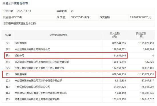 比亚迪盘后龙虎榜显示,深股通专用席位同时为买一和卖一,分别买入8.8亿元,卖出11.96亿元,净卖出3.16亿元;买二兴业证券陕西分公司买入1.86亿元;买三机构专用席位买入1.12亿元,买入前五席合计净买入1.79亿元。卖三中信证券深圳分公司卖出1.52亿元,卖出前五席合计净卖出8.15亿元。