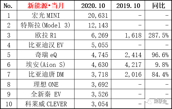 名次上进步最大的是上汽通用五菱,其从9月份的十二名,跳到了第九名,将广汽丰田挤出了前十名。对此贡献最大的无疑是今年7月上市的A00级电动车宏光MINI EV,其月销突破了两万辆,位居10月份新能源汽车销量排行榜第一。
