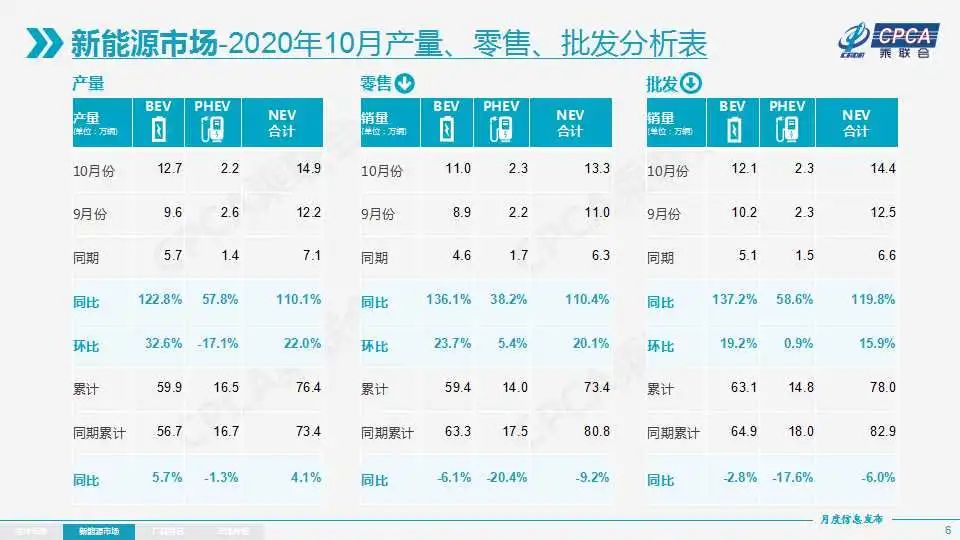 在市场整体回暖的背景下,新能源汽车板块表现极为强势。10月新能源乘用车批发销量突破14.4万辆,同比增长119.8%,环比9月增长15.9%。其中插电混动销量2.3万辆,同比增长58.6%,纯电动的批发销量12.1万辆,同比增长137.2%。