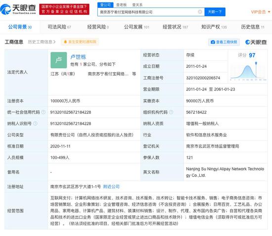 南京苏宁易付宝网络科技有限公司成立于2011年1月,注册资本为10亿人民币,经营范围包含互联网支付;计算机网络技术研发、技术咨询、技术服务、技术转让等。该公司由上海苏宁金融服务集团有限公司全资持股。