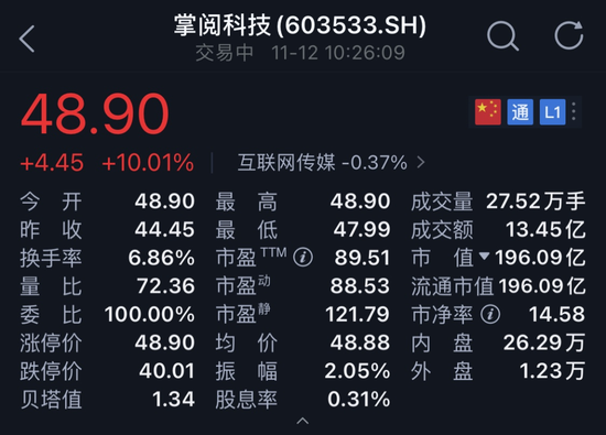 “字节效应”开始显现。截至11月12日,掌阅科技已经实现了6个涨停,市值超196亿,而在11月4日,掌阅科技的市值为110.68亿,几天内的涨动超过85亿。而掌阅科技目前报48.9元/股,已经累计涨77.71%,按此计算字节浮盈11.03亿元。