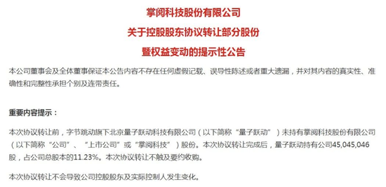上周,掌阅科技发布公告称:公司控股股东、实际控制人成湘均、张凌云与量子跃动签订了《北京量子跃动科技有限公司与张凌云、成湘均关于掌阅科技股份有限公司之股份购买协议》及补充协议,成湘均和张凌云拟将其分别持有的2252.25万股、2252.25万股无限售流通股份协议转让给量子跃动。