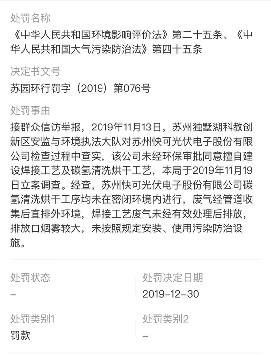 而到了2019年12月,快可电子又因“未经环保审批同意擅自建设焊接工艺及碳氢清洗烘干工艺,碳氢清洗烘干工序未在密闭环境内进行,废气经管道收集后直排外环境,焊接工艺未按照规定安装、使用污染防止设施,有机废气未经有效处理后排放”,而遭到苏州工业园区国土环保局罚款12.13万元。