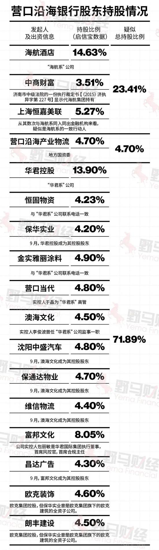 对此,知名经济学家宋清辉向野马财经(微信公众号:YMCJ8686)表示:“营口沿海银行这家属于“海航系”的银行,其17家股东中,有多家公司有迹象表明与“华君系”的公司有关联关系,可以像图片中那样理解为,营口沿海银行已经改名换姓了。并且,在多年内通过这样的方式直接或间接的入股,是否有其他的目的,还有待观察”。
