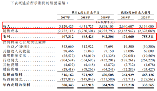 资料显示,2017年-2019年,华润万象生活分别实现收入31.29亿元(人民币,下同)、44.32亿元、58.68亿元。同期,毛利分别为4.07亿元、6.65亿元、9.42亿元。2020年上半年,则是实现收入31.34亿元,同比增加18.68%;毛利约为7.55亿元,同比上升59.13%;期内溢利3.39亿元,较去年同期上升约76.14%。