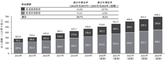而从整体物业服务行业的发展规模来说,华润万象生活未来也是有非常多机会进行商业运营业务的拓展。据弗若斯特沙利文报告,未来随着国内商业运营市场的发展和日趋成熟,中国全业态物业管理及商业运营服务市场规模将不断扩大,预计于2024年将达到6982亿元,2019年至2024年的复合年增长率为8.2%。其中,预计商业运营服务的市场规模到2020年将达到2500亿元,2020以来的年均复合增长速度达到10.7%,增速高于行业总体水平。