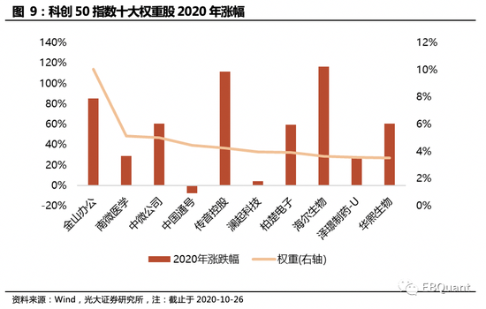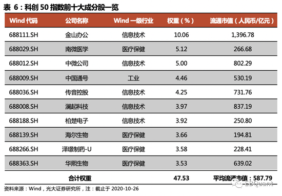 截止2020年10月26日,科创50指数2020年以来涨幅达35.61%,指数十大权重股同期平均涨幅高达54.60%,加权平均涨幅高达57.47%,金山控股今年以来涨幅高达85.06%,传音控股以及海尔生物的股价年内都已翻番,普遍高于科创50指数表现,前十大权重股对于指数业绩贡献明显。