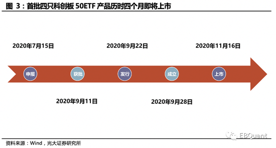 2020年6月19日,上海证券交易所宣布将于7月22日收盘后发布上证科创板50成分指数历史行情;7月15日,易方达、华泰柏瑞、工银瑞信以及华夏四家基金公司同日申报跟踪科创50指数的ETF产品;9月28日,首批四只科创板50ETF产品正式成立,合计募集规模达到209.70亿;从申报到上市历时4个月,首批四只科创板50ETF产品将于11月16日在上交所上市。
