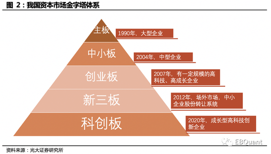 自科创板成立后,我国形成了以主板、中小板、创业板、新三板以及科创板为主的多层次资本市场金字塔体系。不同层次的板块突出特点明显,板块之间互相协调,分工明确,旨在满足不同层次企业及投资者的投融资需求。