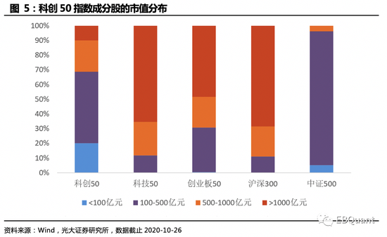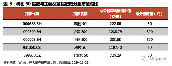 成分股流通市值偏小,与中证500指数较为接近。与主要宽基指数成分股对比,科创50指数成分股总体流通市值偏小,截止2020年10月26日,指数平均流通市值接近222.08亿元,整体中小市值属性较强。