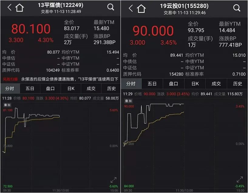 平煤股份、云南城投等企业的部分存续债券也迎来反弹。截至11:30,“13平煤债”涨4.3%,“19云投01”涨3.45%。