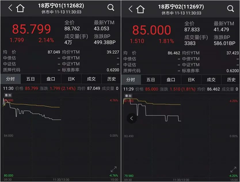 动用真金白金实施“危机公关”的苏宁易购早间迎来存续债的反弹,随后涨幅也纷纷收窄。截至11:30,“18苏宁01”涨2.14%,“18苏宁02”涨1.81%。