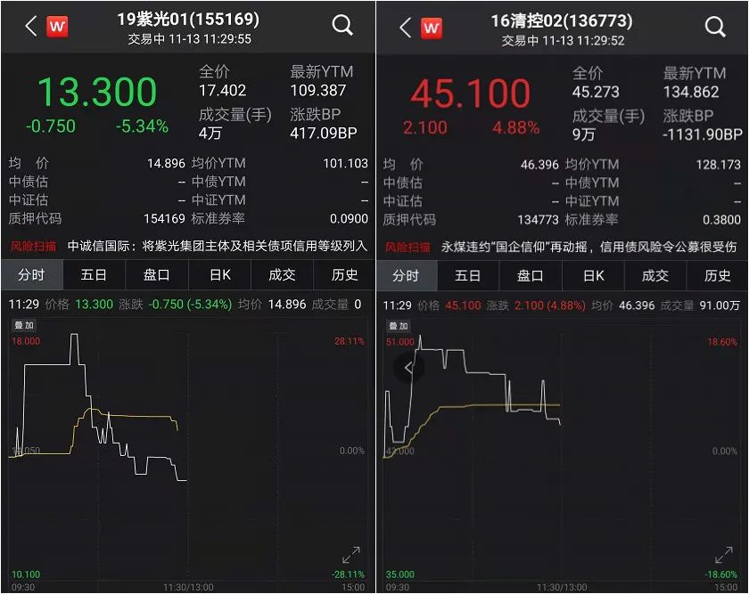 清华控股部分存续债券同样先扬后抑。截至11:30,“16清控02”上涨4.88%,早间一度上涨18.6%;“16清控01”跌0.11%,此前一度涨7.58%。