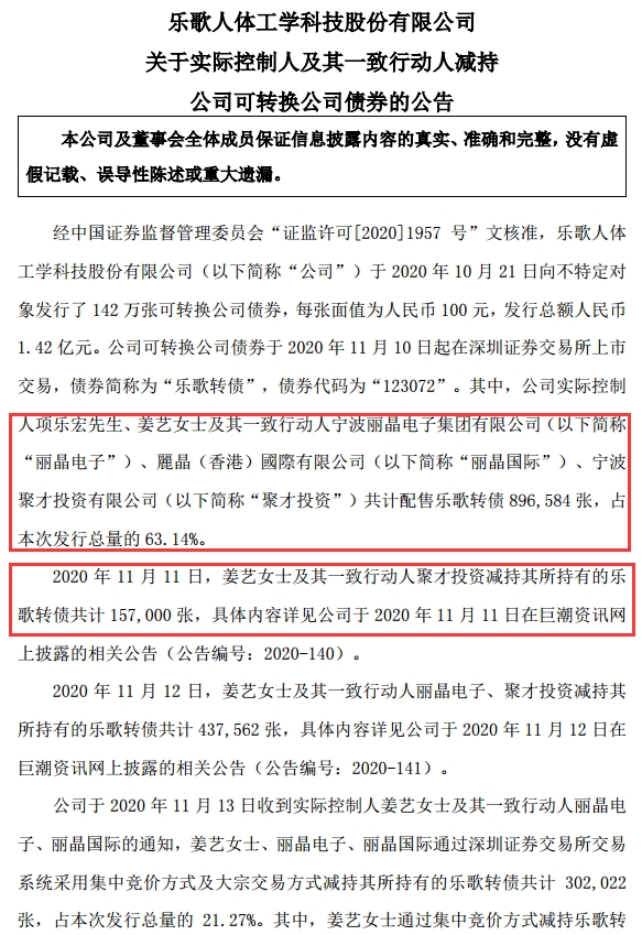 据公告显示,乐歌股份于2020年10月21日向不特定对象发行了142万张可转换公司债券,每张面值为人民币100元,发行总额人民币1.42亿元。其中,公司实际控制人项乐宏、姜艺女士及其一致行动人宁波丽晶电子集团有限公司(丽晶电子)、麗晶(香港)國際有限公司(丽晶国际)、宁波聚才投资有限公司(聚才投资)共计配售乐歌转债896584张,占本次发行总量的63.14%。