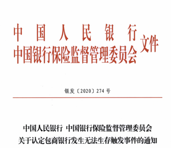 根据该《通知》,2019年5月24日,中国人民银行、中国银保监会对包商银行实施接管。《通知》称,在接管期间,经清产核资,确认包商银行已严重资不抵债,无法生存。根据《商业银行资本管理办法(试行)》等规定,中国人民银行和中国银保监会认定包商银行发生“无法生存触发事件”。
