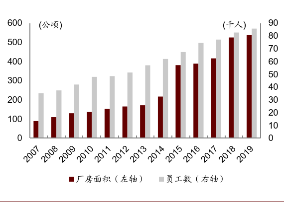 图表: 申洲国际产能扩张:产能分布、厂房面积及工人数