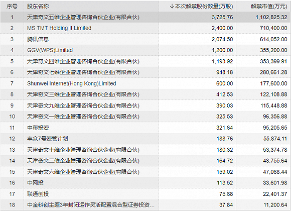 金山办公此次解禁包括首次公开发行部分限售股及战略配售限售股,涉及股东分别为6名和12名。其中天津奇文五维企业管理咨询合伙企业(有限合伙)持股数量最高,3725.76万股,占此次解禁比例的四分之一,市值约110亿元。此外,还包括MS TMT HoldingⅡLimited、腾讯信息、纪源资本、中移投资、中网投、联通创投等。