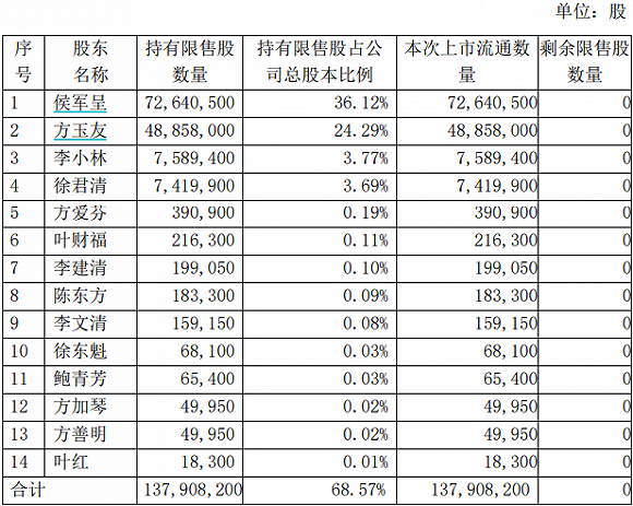 美妆企业珀莱雅(603605.SH)迎来了上市三年的首发限售股解禁。公司11月16日有1.38亿股首发限售股解禁,占总股本比例68.57%,是解禁前流通盘的2倍有余,涉及市值246.69亿元。此次解禁后,珀莱雅几近全流通。
