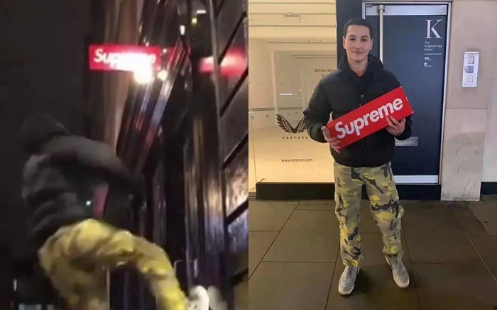 更疯狂的是,曾经有粉丝把Supreme伦敦店的红色招牌撬了,被店长悬赏一件Supreme Box Logo Crewneck全城通缉。