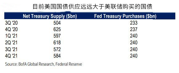 正如美国银行(Bank of America)的迈克尔•哈特尼特(Michael Hartnett)在上周五发布的最新报告中计算的那样,第四季度和明年第一季度美国国债供应将显著超过美联储的购买量,这甚至还没有考虑另一轮大规模财政刺激的可能性。