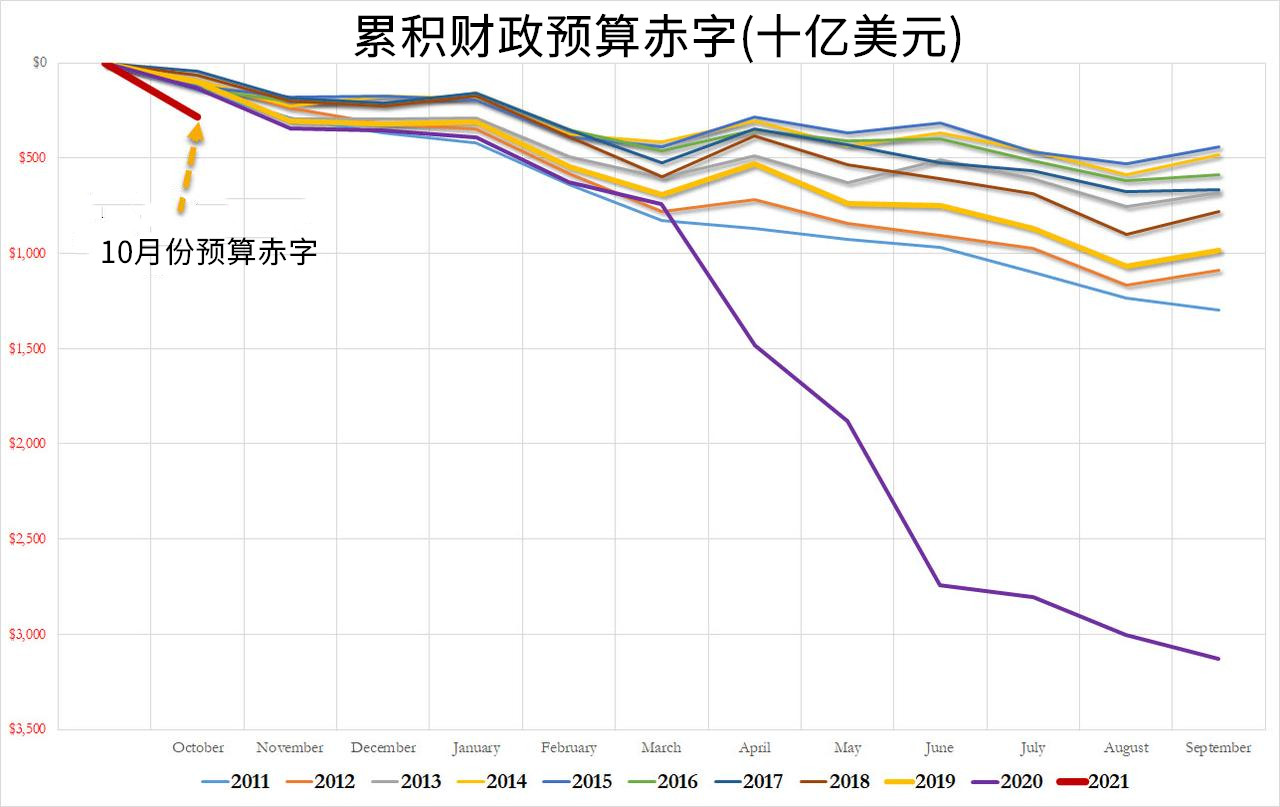 在2021财年伊始(美国政府财年是10月至次年9月末),美国政府10月份的预算赤字就达到2840亿美元,比2019年10月的1340亿美元赤字高出111%,比2009年金融危机和衰退期间创下的同期记录1760亿美元还高出61%。