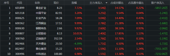 从个股来看,主力资金最青睐的3只股票分别是紫金矿业、中国平安、长安汽车,流入金额分别为3.54亿元、3.25亿元、3.04亿元,所对应的涨幅分别为7.72%、3.20%、7.09%。