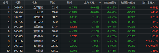 从个股来看,立讯精密、比亚迪、歌尔股份分别遭主力资金卖出10.41亿元、10.04亿元、7.49亿元。