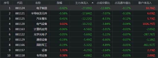 主力资金流出的板块分别是电子制造、半导体及元件、汽车整车,主力资金流出金额分别为27.09亿元、17.84亿元、12.22亿元,其中散户净流入金额为10.76亿元、6.03亿元、5.73亿元。