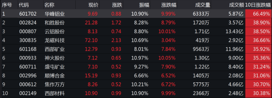 Wind数据显示,近十个交易日,有色金属板块累计上涨15.53%。板块内,华峰铝业累计涨幅超60%,其在11月9日、10日、11日、13日和16日五度涨停,和胜股份、云铝股份、龙磁科技等累计涨幅也超过30%。