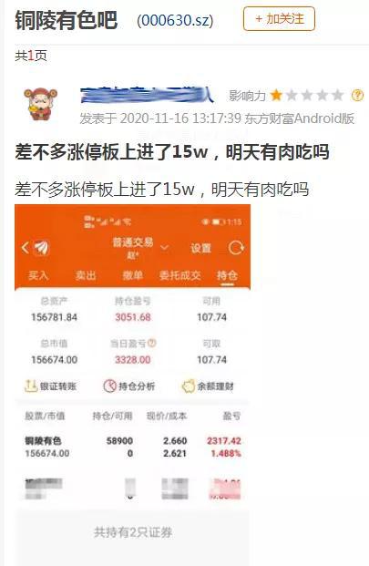 铜陵有色的股吧里,有网友在接近涨停的位置全仓杀入,其说到,明天有肉吃吗?