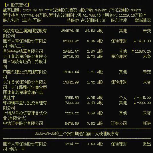 值得注意的是,铜陵有色并未上龙虎榜,不过从三季报来看,股东户数34万户,也是实力机构云集。国华人寿保险股份有限公司-传统二号持有3.21亿股,位列第二大流通股东;中信证券三季度新进6478.69万股,位列第十大流通股东。国华人寿保险股份有限公司-传统一号在二季末持有6204.77万,低于三季报第十大流通股东持股量,因此尚不确定其三季度是否减持。