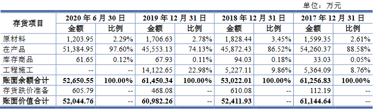 过去四年及一期,在产品为迈赫股份存货的主要构成部分,2017年末、2018年末、2019年末及2020年6月末,在产品账面余额分别为4.33亿元、5.43亿元、4.59亿元、4.56亿元、5.14亿元,分别占存货账面余额的94.88%、88.58%、86.52%、74.13%、97.60%。