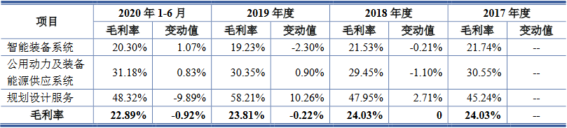 其中,过去四年及一期,该公司智能装备系统毛利率分别为28.43%、21.74、21.53%、19.23%和20.30%,公用动力及装备能源供应系统毛利率分别为20.48%、30.55%、29.45%、30.35%和31.18%,规划设计服务毛利率分别为35.47%、45.24%、47.95%、58.21%和48.32%。