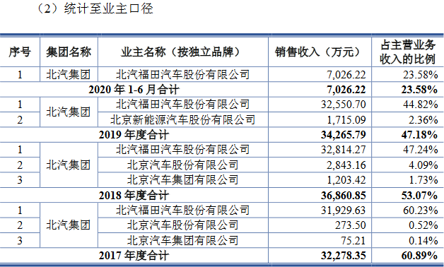 其中,2016年、2017年、2018年、2019年及2020年1-6月,迈赫股份与北汽福田及其子公司的关联销售金额分别为3198.12万元、1636.29万元、3565.31万元、4135.54万元及0万元,占迈赫股份营业收入的9.92%、3.04%、5.08%、5.64%及0.00%。