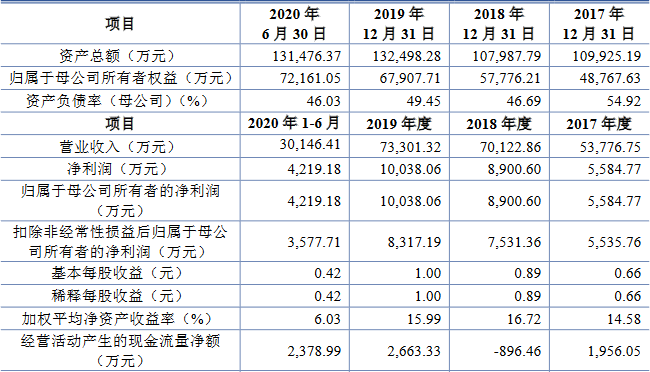 2016年、2017年、2018年、2019年和2020年上半年,迈赫股份实现营业收入分别为3.22亿元、5.38亿元、7.01亿元、7.33亿元和3.01亿元;实现净利润分别为5914.13万元、5584.77万元、8900.60万元、1.00亿元和4219.18万元。