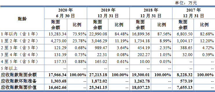 截至2016年12月31日、2017年12月31日、2018年12月31日、2019年12月31日及2020年6月30日,迈赫股份应收账款账面余额分别为5034.04万元、8228.32万元、1.93亿元、2.72亿元及1.80亿元,占同期营业收入的比例分别为15.62% 、15.30%、27.52%、37.13%及59.60%,应收账款账面余额较大且快速增长。