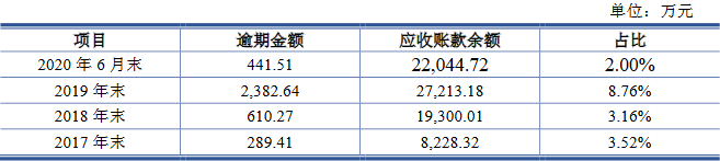 2017年末、2018年末、2019年末、2020年6月末,迈赫股份逾期一年以上的应收账款金额分别为289.41万元、610.27万元、2382.64万元和441.51万元,占比分别为3.52%、3.16%、8.76%和2.00%。