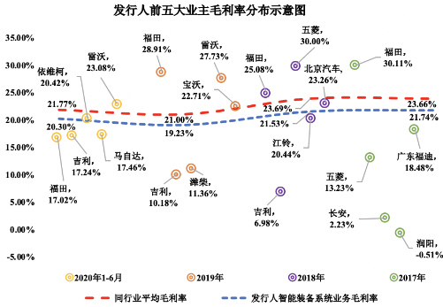 2017年末、2018年末、2019年末及2020年6月末,同行业可比上市公司毛利率平均值分别为23.66%、23.69%、21.00%和21.77%。