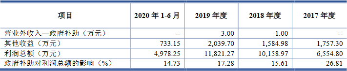 2017年、2018年、2019年及2020年1-6月,迈赫股份收到的计入营业外收入及其他收益的政府补助金额为2098.00万元、1757.30 万元、1585.98万元、2042.70万元及733.15万元,分别占当期利润总额的30.01%、26.81%、15.61%、17.28%及14.73%。