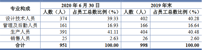 按员工专业构成分类,截至2019年末和2020年6月末,迈赫股份及子公司设计技术人员分别为402人和374人,占员工总数比例分别为40.28%和39.33%;管理及后勤人员分别为166人和161人,占员工总数比例分别为16.64%和16.93%;生产人员分别为404人和391人,占员工总数比例分别为40.48%和41.11%;销售人员分别为26人和25人,占员工总数的比例分别为2.60%和2.63%。