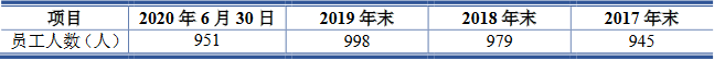 截至2016年末、2017年末、2018年末、2019年末、2020年6月末,迈赫股份及子公司的员工人数分别为958人、945人、979人、998人和951人。