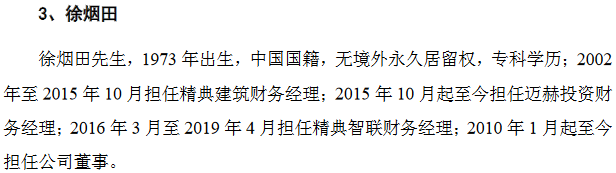 据招股书,2010年1月起至今,徐烟田担任迈赫股份董事一职;2015年10月起至今在迈赫股份的控股股东迈赫投资担任财务经理一职。而2016年3月至2019年4月,徐烟田曾担任关联方精典机电的子公司天津精典智联装饰工程有限公司(以下简称“精典智联”)财务经理一职。