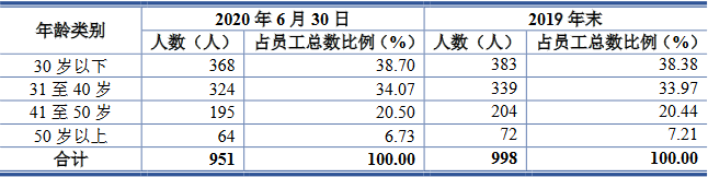 按员工年龄构成分类,截至2019年末和2020年6月末,迈赫股份及子公司30岁以上员工人数分别为383人和368人,占员工总数比例分别为38.38%和38.70%;31至40岁员工人数分别为339人和324人,占员工总数比例分别为33.97%和34.07%;41至50岁员工人数分别为204人和195人,占员工总数比例分别为20.44%和20.50%;50岁以上员工人数分别为72人和64人,占员工总数比例分别为7.21%和6.73%。