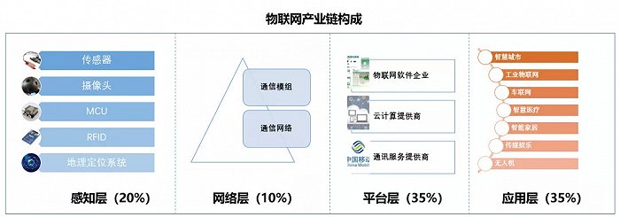 从全产业链的价值分布看,平台层和应用层各占35%左右,感知层占20%,网络层占10%,主要的增加值体现在平台和应用上。按照国信证券通信研究所的说法,叫“连接先行,应用后至,平台为王”。