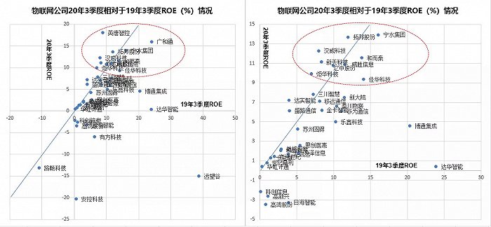 从上图我们可以发现,受疫情影响,今年前三季度,大部分物联网上市公司的ROE都没有高于去年同期。