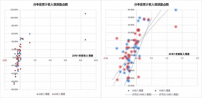 上图是2020年一二三季度收入累计增速散点图,其中横轴为40家上市公司一季度收入增速,纵轴分别对应着同一家公司二三季度的收入增速,左边图是全图,右边图是放大后的局部。