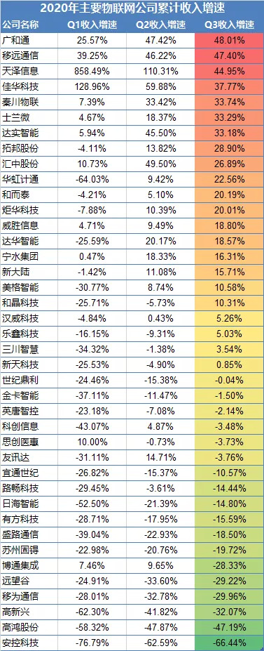 上图是40家物联网上市公司分季度的累计收入增速。2020年三季度累计收入增速最高的前两个公司广和通和移远通信都是通讯模组公司,但同是模组公司的日海智能、有方科技以及移为通信则表现一般,前三季度的收入累计增速依然为负,依旧没有回到去年同期的水平。